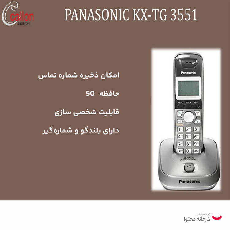 اگر به دنبال خرید یک تلفن ارزان قیمت و باکیفیت هستید، ما به شما تلفن پاناسونیک KX-TG3551 را پیشنهاد میکنیم. اگرچه این محصول، از قابلیتها و امکانات پیشرفته برخوردار نیست، اما برای مکالمهای روزانه، یک گزینه فوقالعاده محسوب میشود. روی گوشی بی سیم 3551 یک نمایشگر 1.4 اینچی قرار دارد که با پشتیبانی از فناوری Amber و نور پس زمینه، شمارهها را با وضوح و دقت بسیار خوبی، به شما نمایش میدهد. کلید اسپیکر برای مکالمههای بدون دخالت دست، روی گوشی این تلفن تعبیه شده است. KX-TG3551 از تکنولوژی ECO پشتیبانی میکند که میتواند مصرف باتری را به شکل قابل ملاحظهای کاهش دهد. کلید R برای فعالسازی این تکنولوژی، روی صفحه کلید و در زیر کلید قطع کردن تماس، دیده میشود. کاربران تلفن پاناسونیک 3551 میتوانند تا سقف 100 شماره تماس را در حافظه این دستگاه ذخیره نمایند. از دیگر نقاط قوت این تلفن، میتوان به شمارهگیری مجدد یا همان Redial اشاره کرد. این قابلیت به شما اجازه میدهد با 10 شماره آخری که با آنها مکالمه داشتهاید، تماس مجدد برقرار کنید. کیفیت صدای تلفن KX-TG3551 نسبت به محصولات همرده، کاملا قابل قبول است. بد نیست بدانید که شدت صدای این دستگاه و همچنین صدای زنگ آن، در 5 سطح، قابل کم یا زیاد شدن است. برای روشن کردن گوشی بیسیم KX-TG3551 به دو عدد باتری قابل شارژ AAA نیاز دارید که در داخل جعبه دستگاه، قرار داده شدهاند. اگر این باتریها را به صورت کامل و به مدت 7 ساعت شارژ کنید، میتوانید تا 10 ساعت روی شارژدهی مکالمه گوشی بی سیم حساب کنید. البته این زمان در وضعیت آماده به کار، به 200 ساعت نیز خواهد رسید. به عنوان یکی از نقاط ضعف این تلفن، میتوان به فرکانس 2.4 گیگاهرتز آن اشاره کرد که میتواند، منجر به تداخل با سایر دستگاههای وایرلس شود. البته به شما اطمینان میدهیم که با توجه به قیمت مناسب، کیفیت بالا و دوام و ماندگاری زیاد KX-TG3551 بسیار بعید است که از خرید آن؛ پشیمان شوید.پاناسونیک در ساخت تلفن بیسیم KX-TG3551 نهایت کیفیت را به کار برده است. گوشی بیسیم این محصول، تنها 130 گرم وزن دارد و در مکالمههای طولانی مدت، هیچ فشاری را به دست شما وارد نمیکند. این گوشی در ابعاد 48 x 32 x 159 میلیمتر و همراه با یک ال سی دی 1.4 اینچی طراحی شده است.