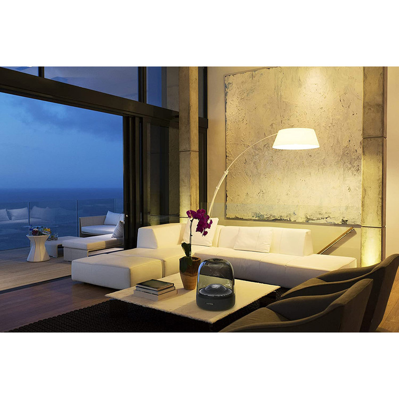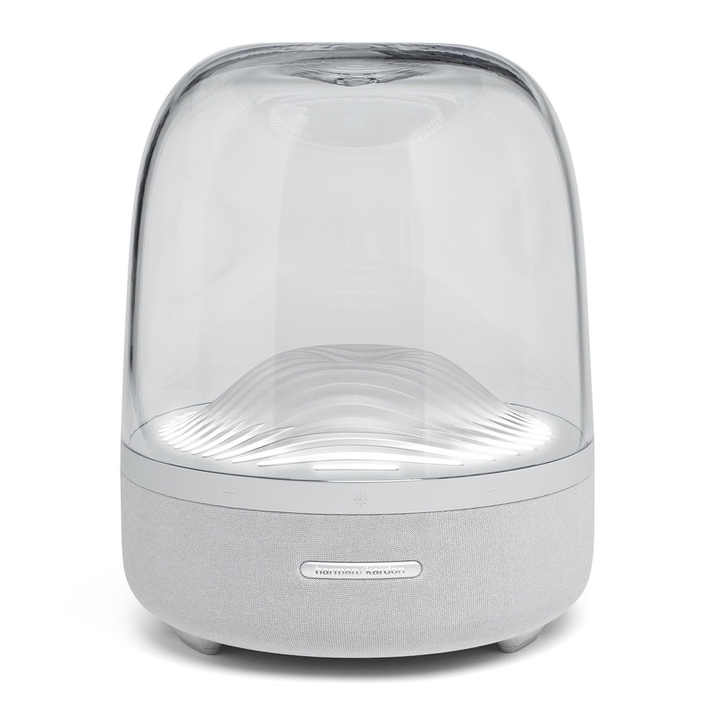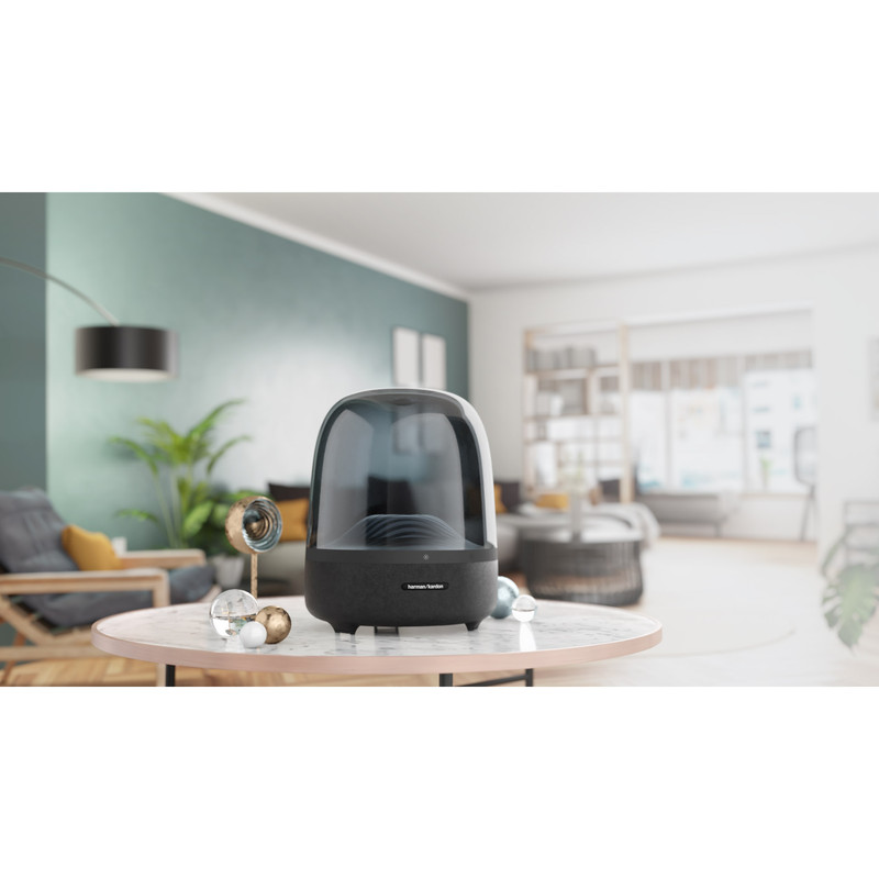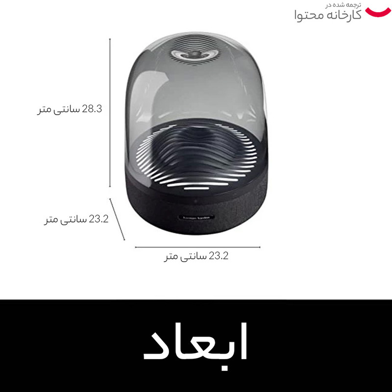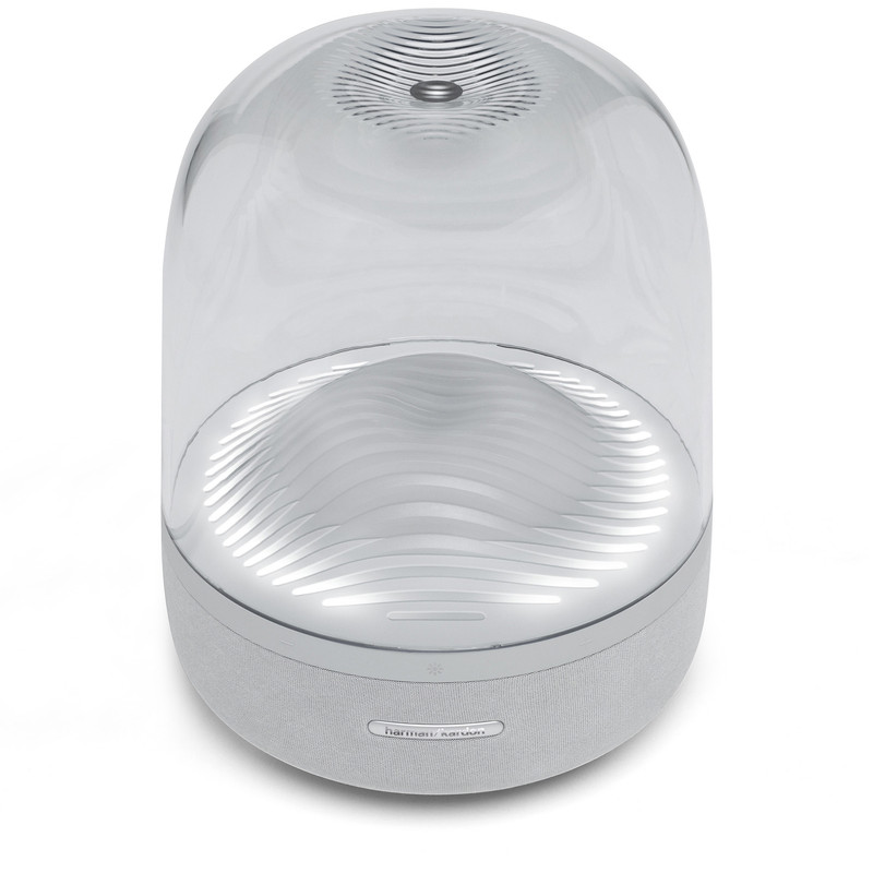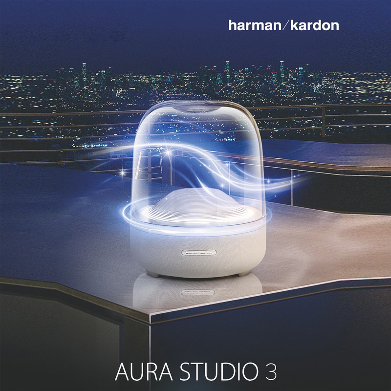 اسپیکر خانگی هارمن کاردون مدل Aura Studio 3نسبت به مدلهای قبلی خود تغییراتی داشته است که این سیستم صوتی را بروز تر کرده است. در نگاه اول توجه شما به اشکال موج شکل که در داخل گنبد شیشه ای وجود دارد جلب خواهد شد که جلوه ی زیبایی به این اسپیکر داده است. همچنین نورپردازی خارق العاده که با این اشکال موجی شکل ترکیب شده است نمایی چشمگیر ایجاد کرده است. البته این نور بسیار زیبا در محیطهای تاریک بیشتر نمایان شده و باعث جذابیت هر چه تمام تر این محصول لاکچری میشود. بر روی بدنه ی اسپیکر دکمههای لمسی برای کنترل اسپیکر وجود دارد که از طریق آنها میتوان دستگاه را روشن و خاموش کرد ، بلوتوث را روشن کرده و در حالت جستجو قرار داد ، نورپردازی را فعال و غیر فعال کرد و ولوم صدای اسپیکر را کم یا زیاد کرد.